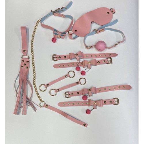 БДСМ набор "Колокольчик" розово-голубого цвета (наручники, кляп, паножи, ошейник, поводок, флогер, маска, два карабина)