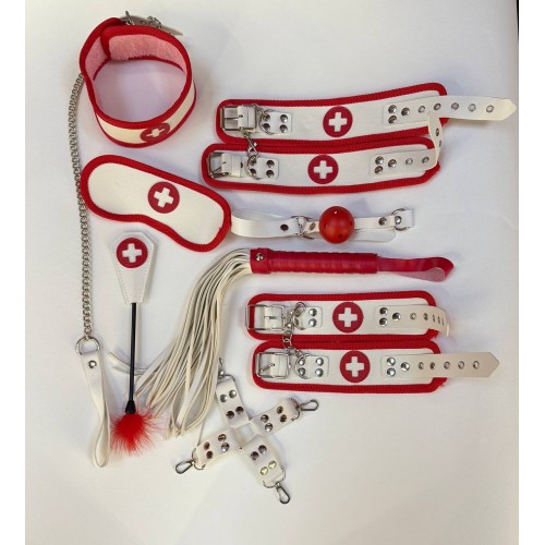 Комплектация: наручники, поножи, ошейник, кляп, поводок, плеть, крестовина, маска, стек-тиклер